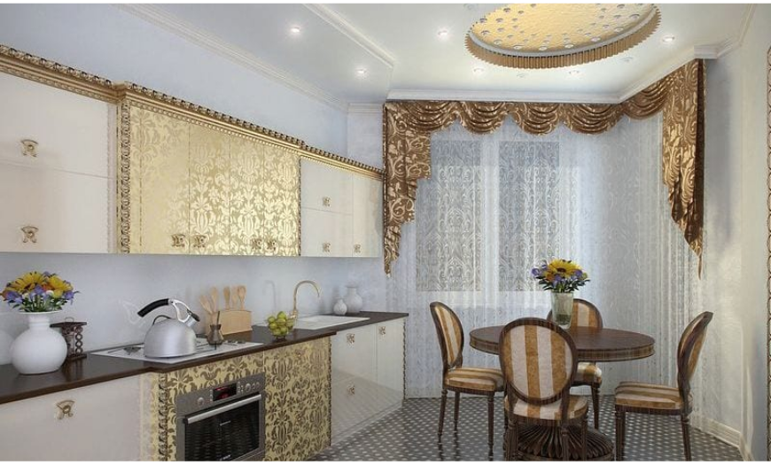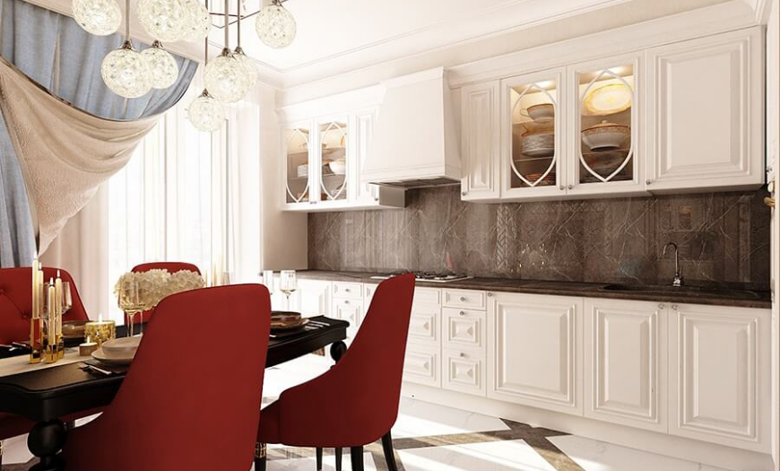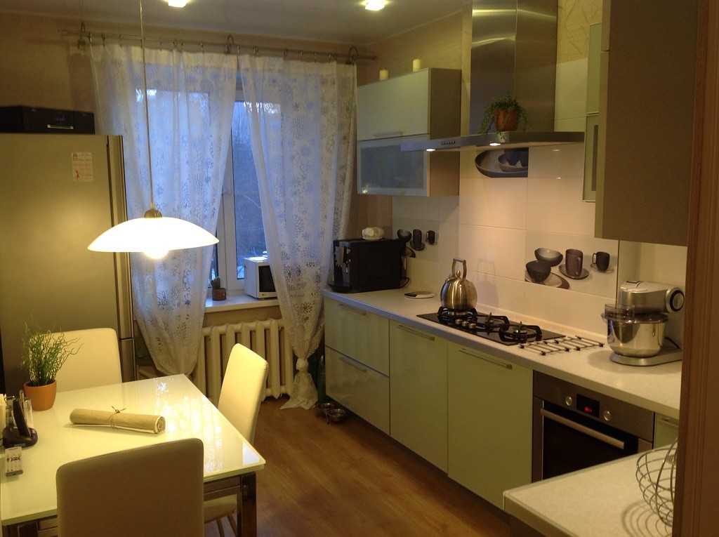 Кухонный гарнитур ставится вдоль одной из стен. Высвобождается много места для обеденной зоны, где можно поместить даже диван и несколько стульев около большого стола, желательно раскладного.