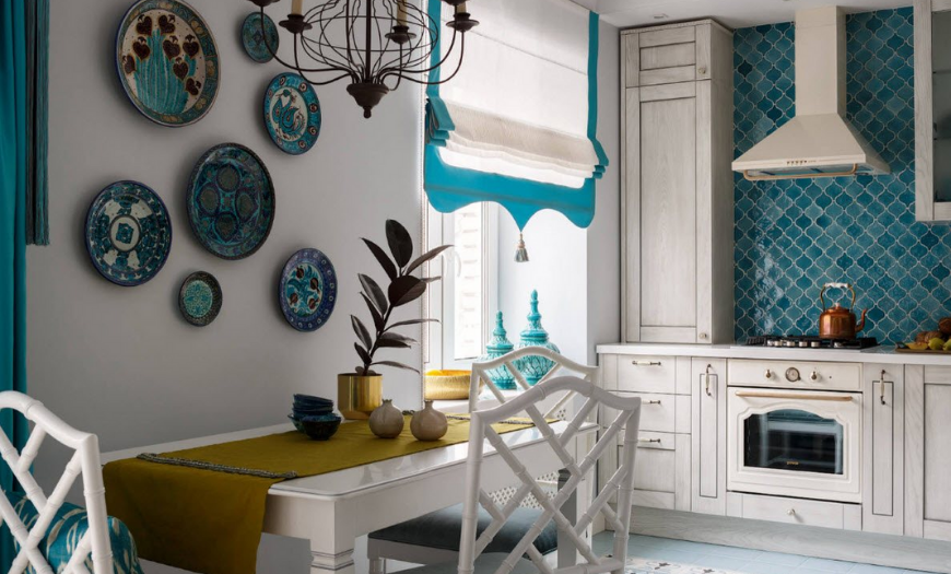 Например, на кухне можно оклеить обои с цветочным принтом или воплотить этнический стиль с характерным рисунком в отделке стен, фартука или текстильного декора (шторы, одеяла, полотенца и т.д.).