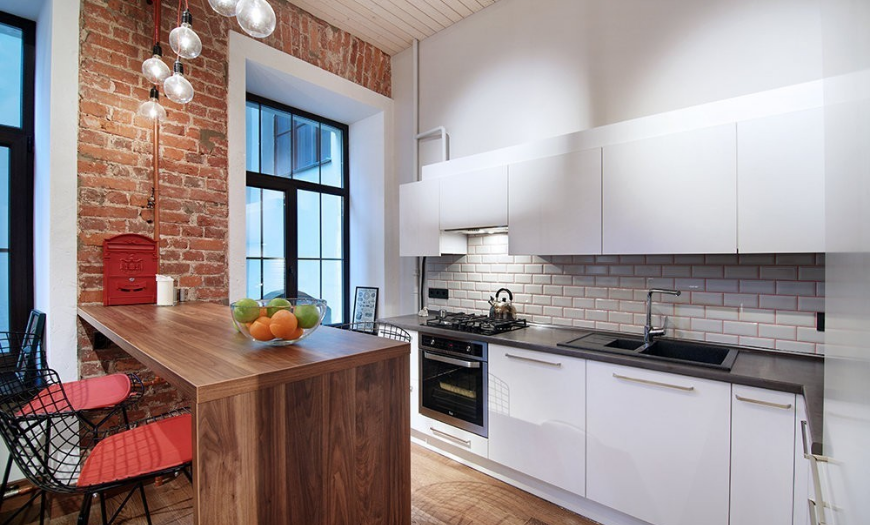 Размер обеденного стола зависит от того, сколько человек проживает в квартире. Если обеденная зона предназначена для быстрого перекуса, следует установить стильную барную стойку со складными стульями.