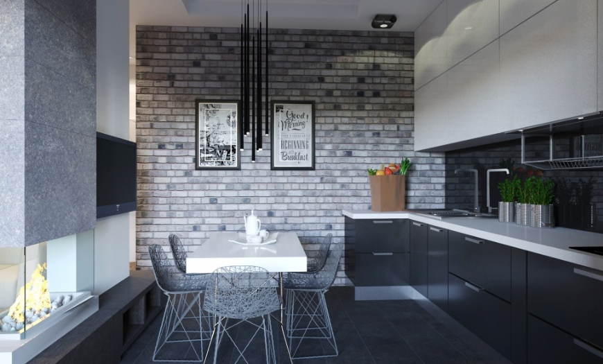 Противоположную гарнитуру стену можно оформить декоративным камнем или кирпичом. После монтажа лучше его обработать пропиткой, чтобы меньше пылился и не терял первоначальный цвет.