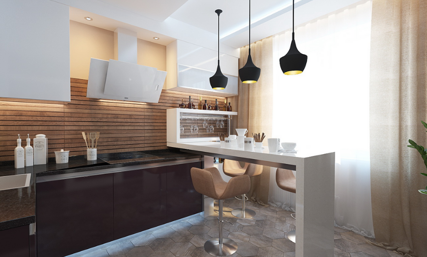 Размер обеденного стола зависит от того, какое количество человек живет в квартире. Если зона приема пищи планируется для быстрого перекуса, уместно установить стильную барную стойку с раскладными стульями.