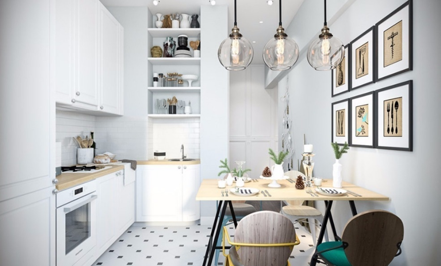 Каждая вещь на кухне должна быть максимально функциональной. К примеру, диванный уголок обязательно следует оборудовать нишей под сиденьем, в которой можно хранить разную кухонную утварь. Все шкафчики должны максимально тянуться вверх, тем самым вытягивая пространство кухни. Визуально расширить помещение помогут горизонтальные полосы на стенах.