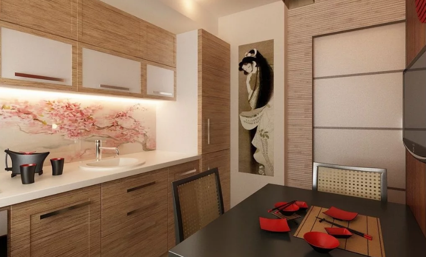 Кухонная площадь, объединенная с балконом, становится удобнее, полезнее и эстетичнее. Кроме того для такой кухни 9 кв м открывается множество декораторских идей. К примеру, такой недостаток, как оконный выступ, может стать нестандартным столом для чайных церемоний.