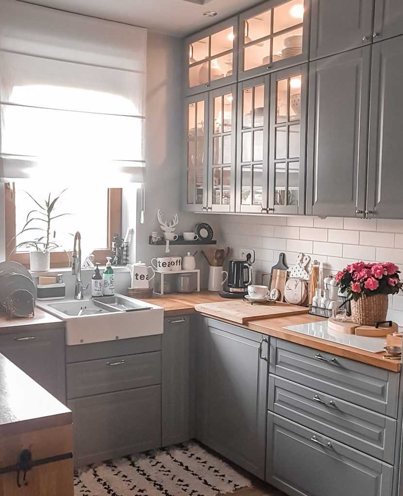 Например, если кухня расположена в узкой вытянутой нише, примените линейную или П-образную меблировку без верхних шкафов. Заменить шкафы можно открытыми полками.