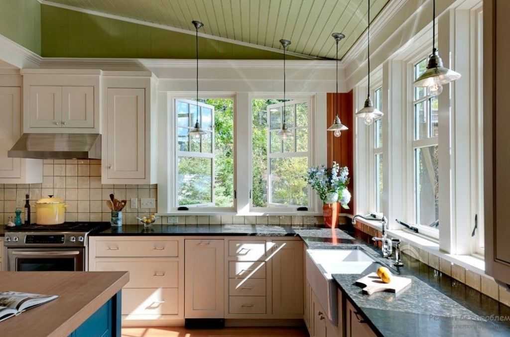 В случае, если окна находятся на смежных кухонных стенах, рекомендуется заполнить пространство между ними угловым шкафом. Он гораздо вместительнее и выглядит оригинально. Кроме того, вы можете открыть его, и тогда пространство будет выгодно с точки зрения дизайна. Любители сериалов и развлечений могут установить телевизор на один ряд полок.