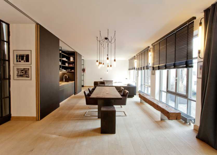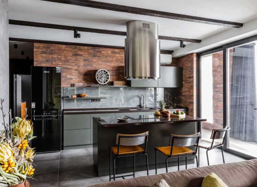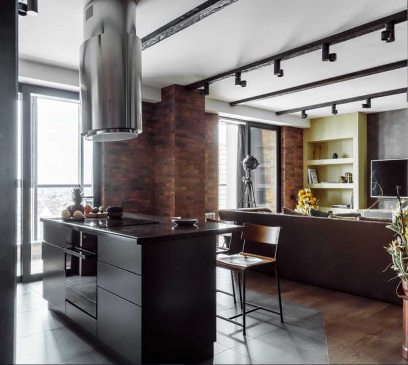 Лофт несколько лет держится в топе стилей для кухни, совмещенной с гостиной. Тут можно найти бетон и кирпич, металл, натуральный паркет и открытую планировку без перегородок. Хорошо в этот стиль вписываются кожаные диваны, самобытные предметы интерьера, необычный модульный дизайн и подвесные светильники.