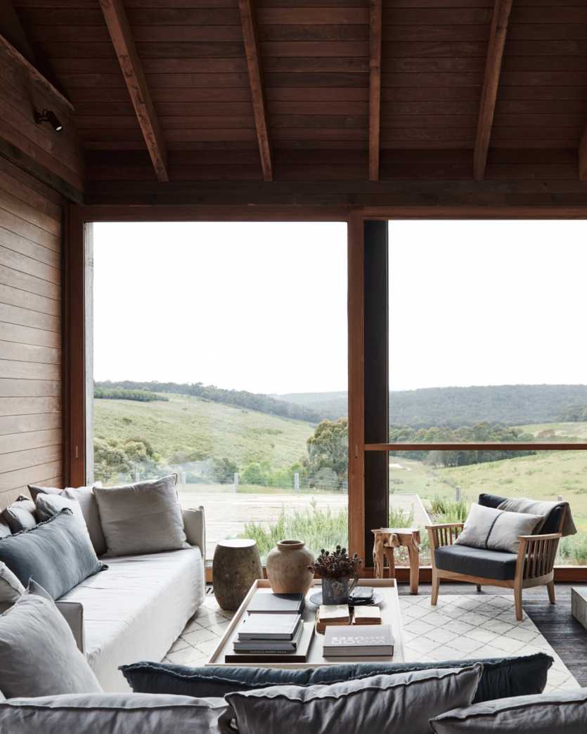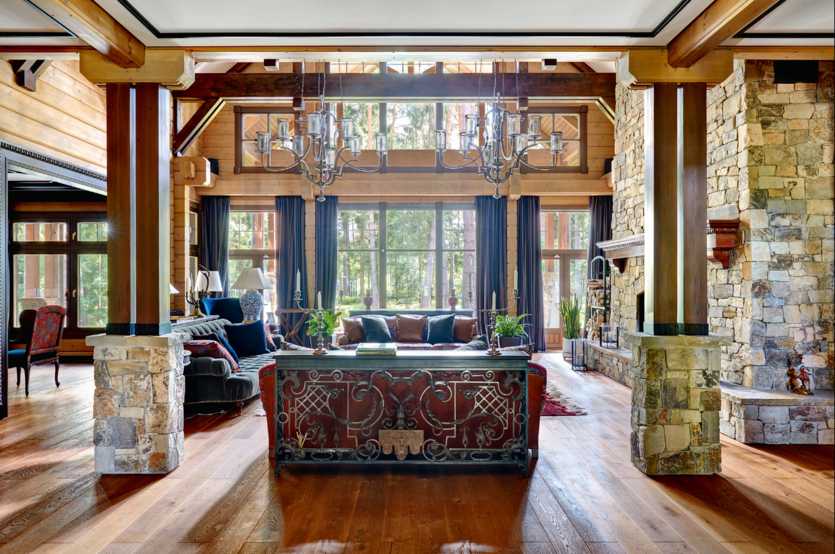 Если из панорамных или просто высоких окон открывается хороший обзор на лес, озеро, красивый сад и другие интересные виды, есть смысл «развернуть» всю обстановку на них, чтобы красоту было видно из каждой точки общественной зоны.