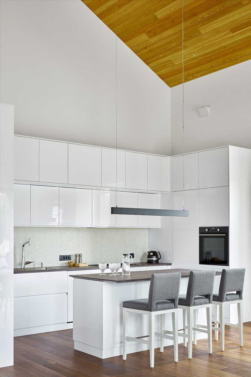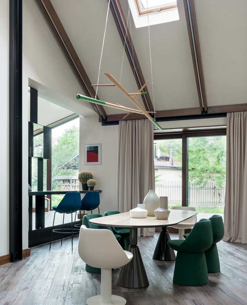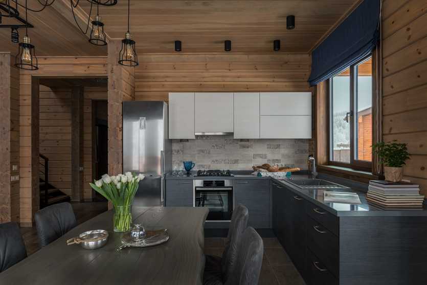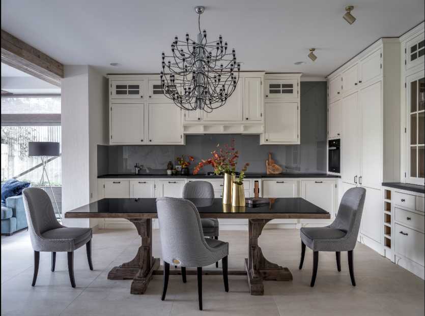 Дом имеет свои преимущества – немалый простор. Есть возможность организовать пространство с панорамными окнами и выходом в сад. А внутри создать несколько функциональных зон: кухню, обеденную зону и зону отдыха.