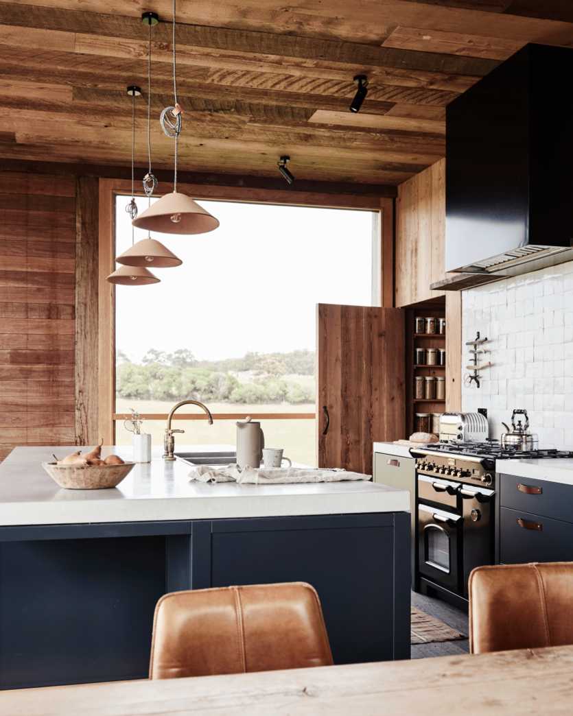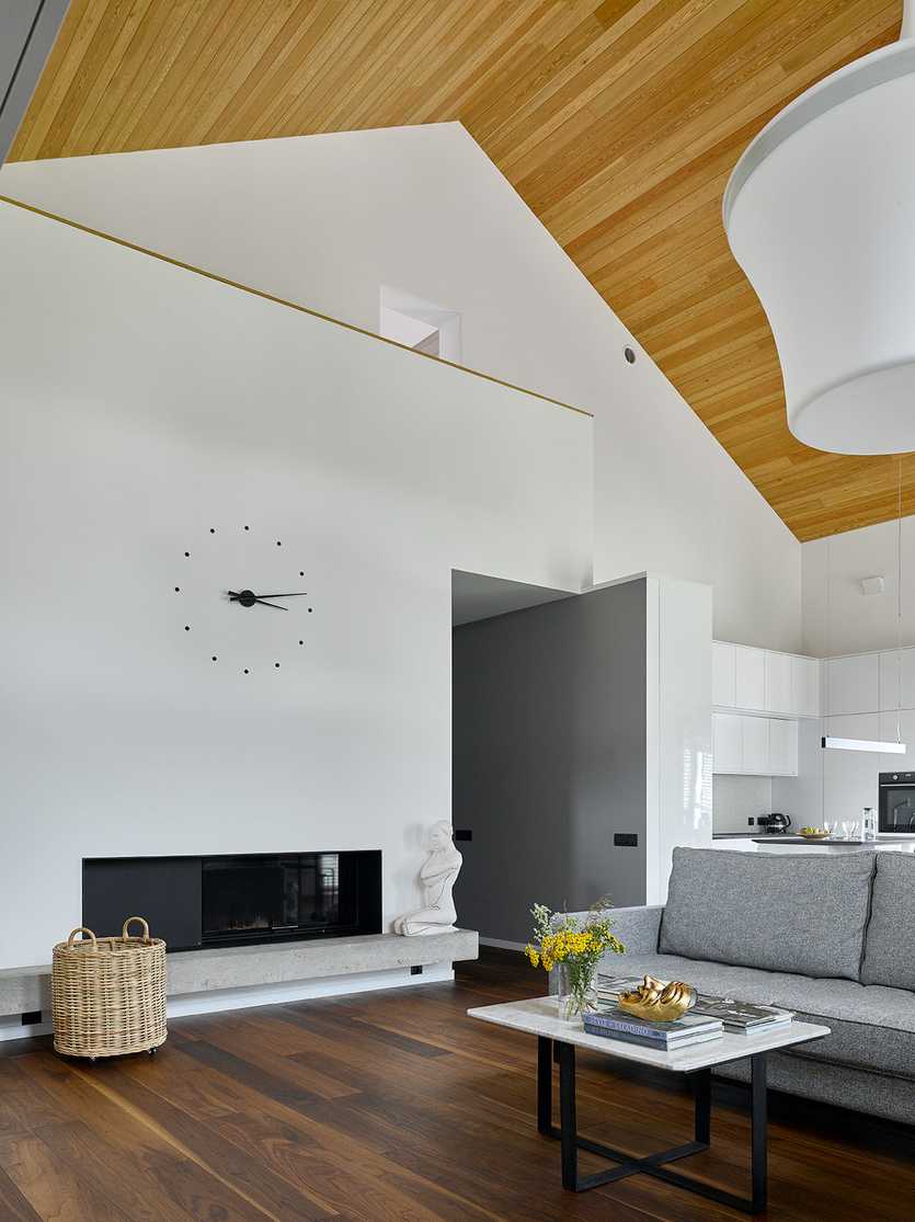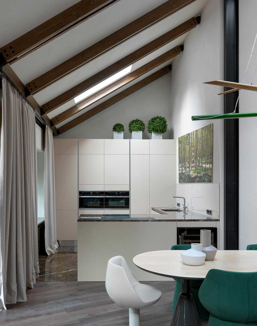Своеобразным отделяющим барьером между кухней и мягкой зоной отдыха станет барная стойка. Свет и ощущение свежести, обилия воздуха в пространстве обеспечат панорамные окна с видом на сад.