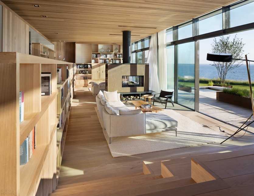 Самое удобное расположение, когда первые ступени находятся у входа в гостиную. Тогда домочадцам и гостям не нужно проходить через всю комнату, чтобы подняться на второй этаж. Частично открытая лестница занимает немного места, а площади гостиной достаточно для расстановки мебели, оборудования каминной зоны, библиотеки и размещения бытовой техники.
