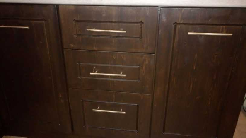 Все тумбы имеют глубину 500 мм., и при глубине столешницы 600 мм. получаем свес спереди 50 мм. и, соответственно, свободное пространство между стеной и тумбой тоже 50 мм. Много это или нормально? Спереди добавятся фасады 18 мм., но еще будут ручки — в моем случае 30 мм., так что, свес в 50 мм. вполне оправдан.