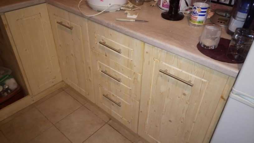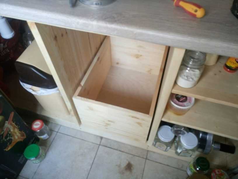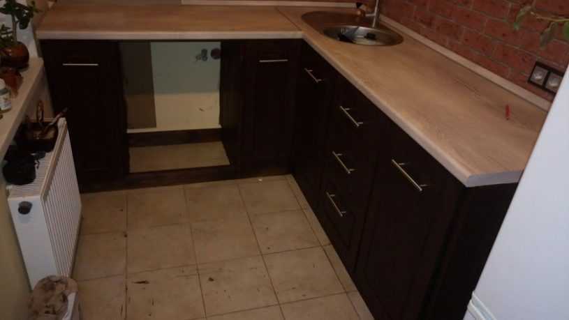 Все тумбы собраны по принципу накладного дна, то есть боковины стоят на основании. Каждая тумба установлена на 4 регулируемые опоры (под мойку — 6 штук), в последствии закрывающихся цоколем. Чтобы не упираться ногами подойдя к рабочей зоне кухни, цоколь утоплен вглубь.