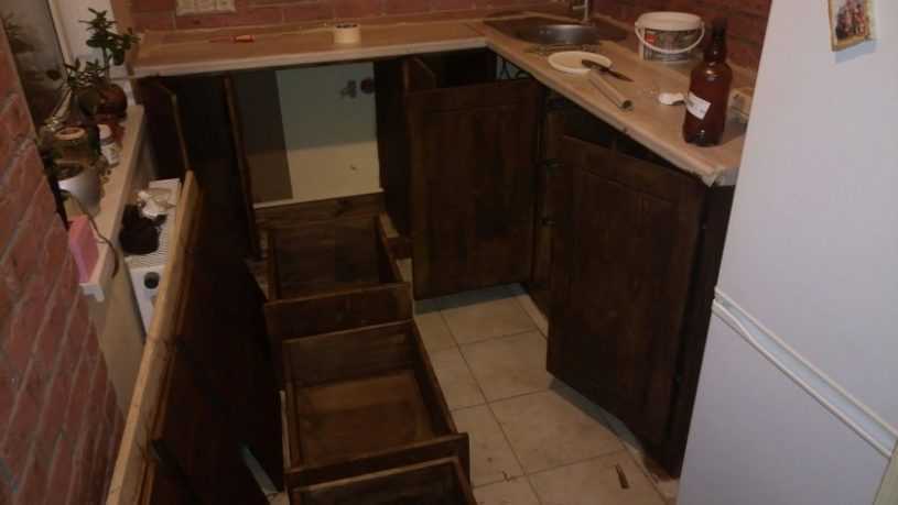 Шкафчики по очереди устанавливаются на свои места и стягиваются между собой. Для стягивания применяется специальная межсекционная стяжка. В качестве альтернативы можно использовать саморезы длиной 30 мм. Работать они будут не хуже. Шляпки саморезов можно скрыть самоклеющейся заглушкой, также маскируют шляпки конфирмата.