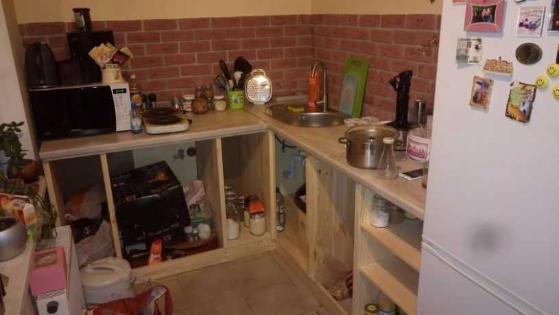 Рис.12. Собранный каркас нижнего ряда шкафов с установленной столешницей.