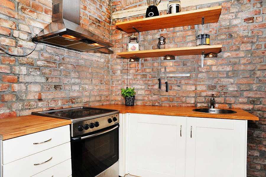 Классикой стиля считается кирпичная кладка. Чтобы не уменьшать пространство кухни, для отделки часто используют декоративные кирпичные панели. В больших по площади помещениях в качестве отделки могут использовать кладку из грубых кирпичей. Если необходимо визуально расширить помещение кирпичи красят в светлые тона под побелку.