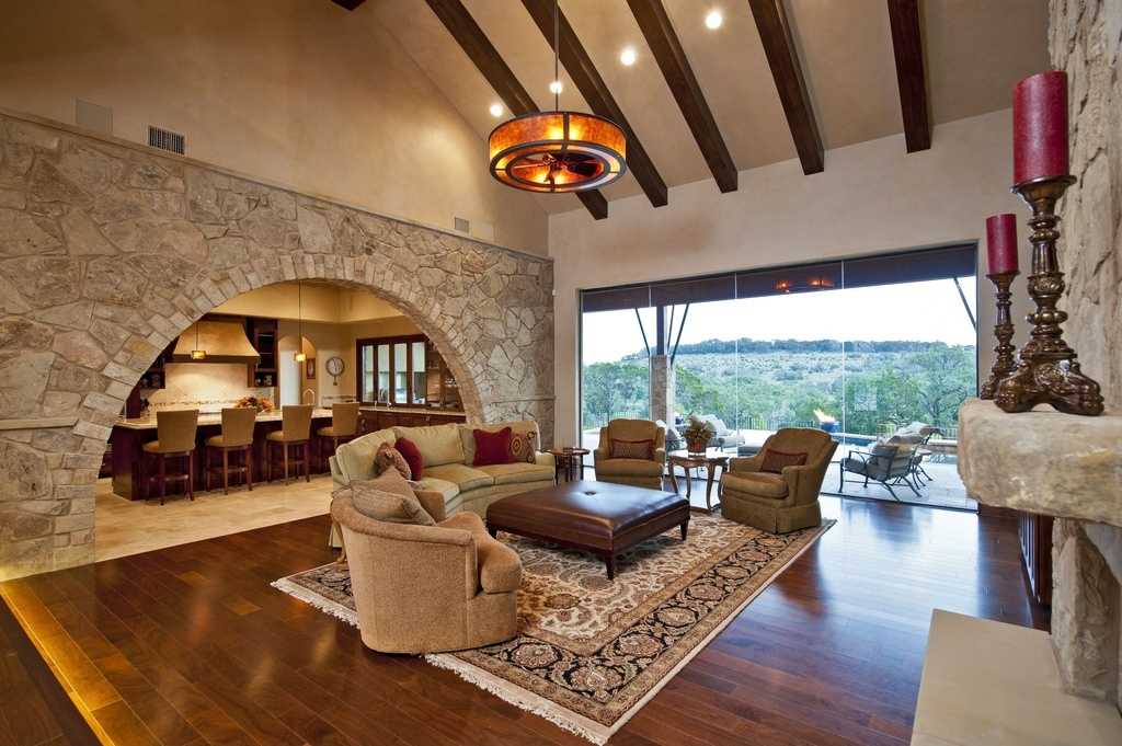 В этом направлении для отделки, как правило, используются гранит или мрамор. В рабочей зоне выкладывается фартук из мозаичной плитки. Зонирование выполняется в виде арок, выложенных из кирпича или грубого камня. В оформлении помещения применяют все оттенки коричневого и бежевого, черного и белого.