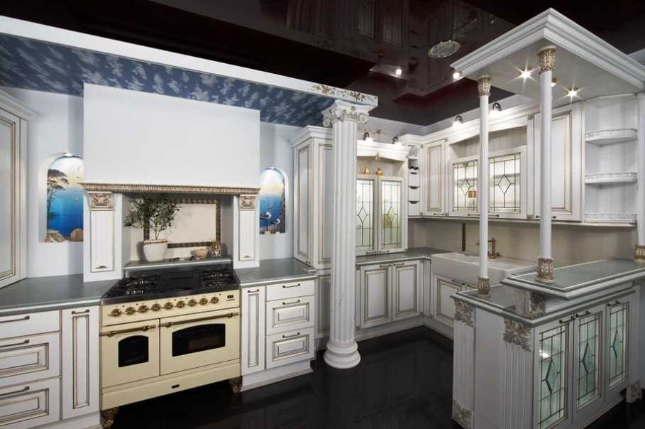 Это сочетание роскоши и красоты. Высокий потолок, двустворчатые двери и огромные оконные проёмы — главные отличительные черты. Кухонные гарнитуры в стиле ампир не только смотрятся дорого, но и стоят прилично, так как изготавливаются из ценных пород дерева.