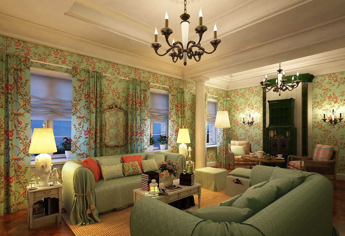 Стены чаще всего красят, штукатурят или оклеивают обоями. Последнее решение — самое простое и традиционное для гостиной в стиле прованс. При совмещении ее с кухней, можно с помощью отделки стен зонировать это пространство. Например, в рабочей зоне используют краску или штукатурку, а в зоне отдыха — обои с мелким цветочным рисунком. Для получения гармоничного дизайна кухни с гостиной в стиле прованс нужно подобрать одни оттенки. К примеру, это будет один и тот же фон, а узор на обоях — в цвете аксессуаров. Можно сделать иначе — подобрать краску для кухонных стен в тональности орнамента отделки. Такое единство палитры совмещает визуально помещения, расставляя при этом акценты, необходимые для зонирования.