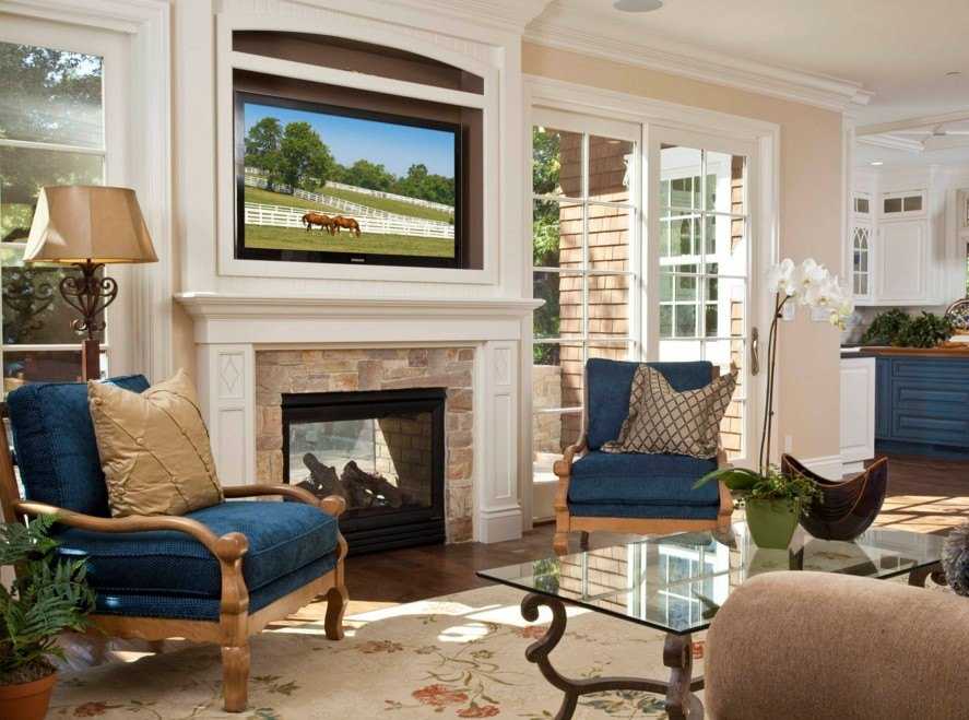 Чаще всего камин устанавливается недалеко от стены с телевизором.