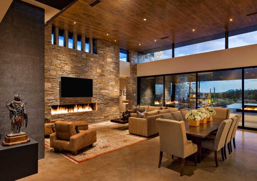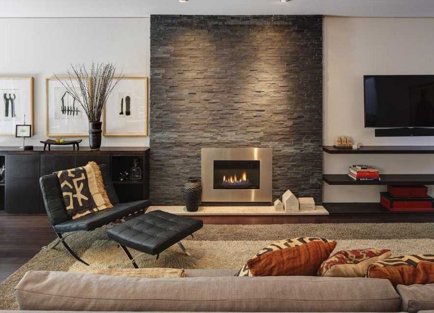 В гостиных с большой площадью популярной будет облицовка натуральным камнем. При помощи этого уникального, достойного материала оформляются конкретные места как на полу, так и на стенах. Неплохим вариантом для этих целей можно считать керамогранит.