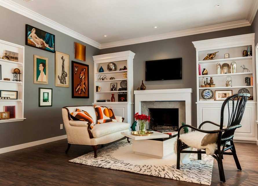 Стены гостиной можно украсить парой больших полотен с объемными изображениями или зеркалами в незатейливых рамах. Для оформления зала идеально подойдут живые растения или цветы в вазах. На полках желательно расставить умеренный декор в виде книг, статуэток или интерьерных свечей.