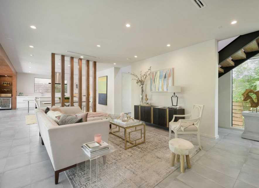 Интересным решением также являются ажурные или стеклянные стены натуральных цветов, которые разделяют интерьер и в то же время обеспечивают свободный поток света в гостиную с кухней.