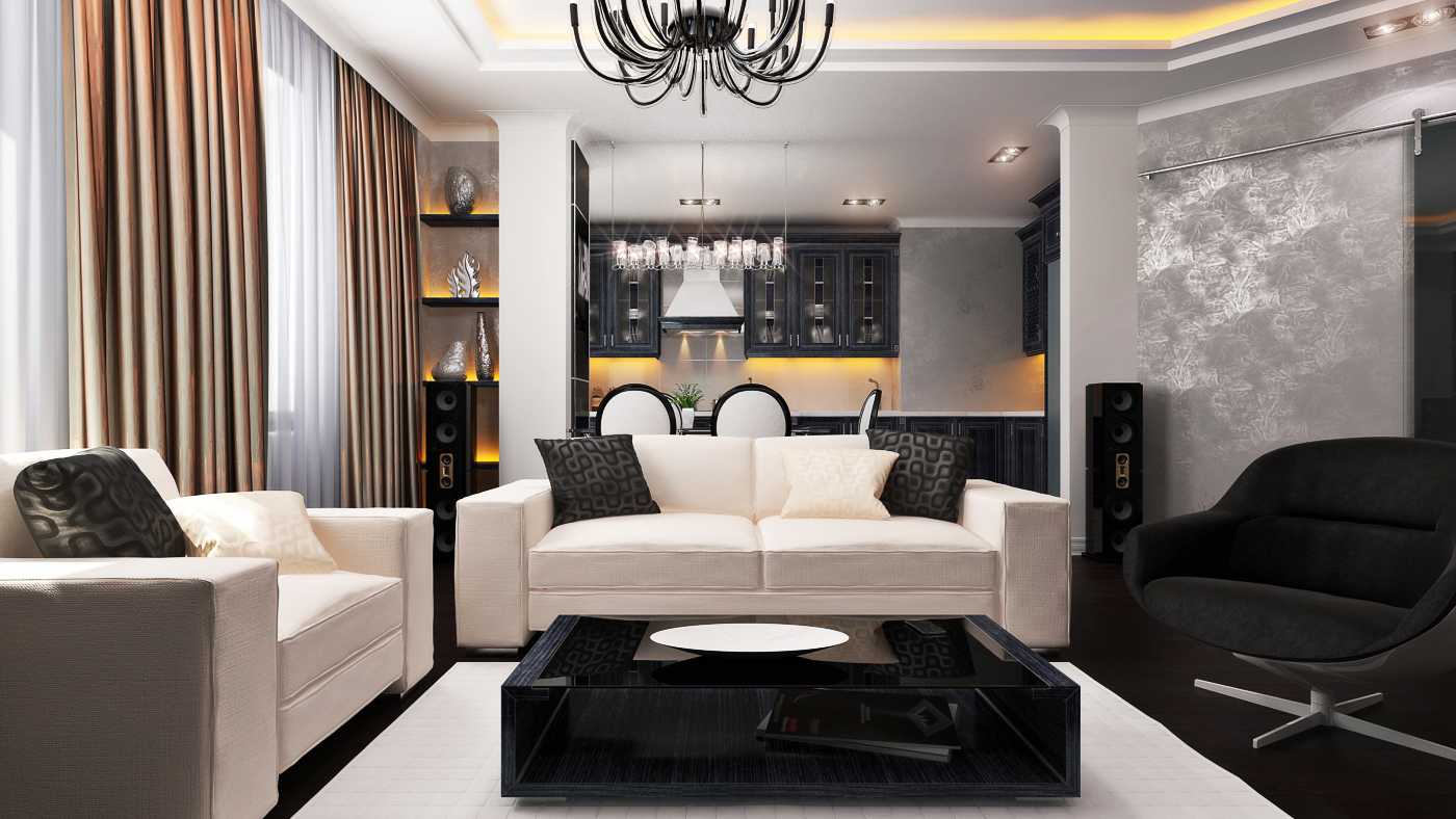 Особого внимания требует обеспечение хорошего воздухообмена и вентиляции, чтобы запахи с кухни не проникали на территорию гостиной.