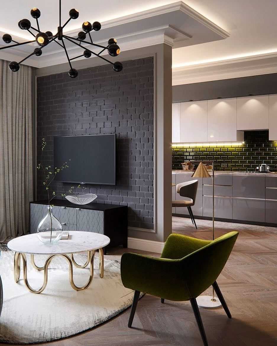 При выборе интерьера гостиной с кухней 2021 года делают акцент на возвращение к классическому стилю. Решение подходит для малогабаритных (до 22 квадратов) помещений на европейский лад:
