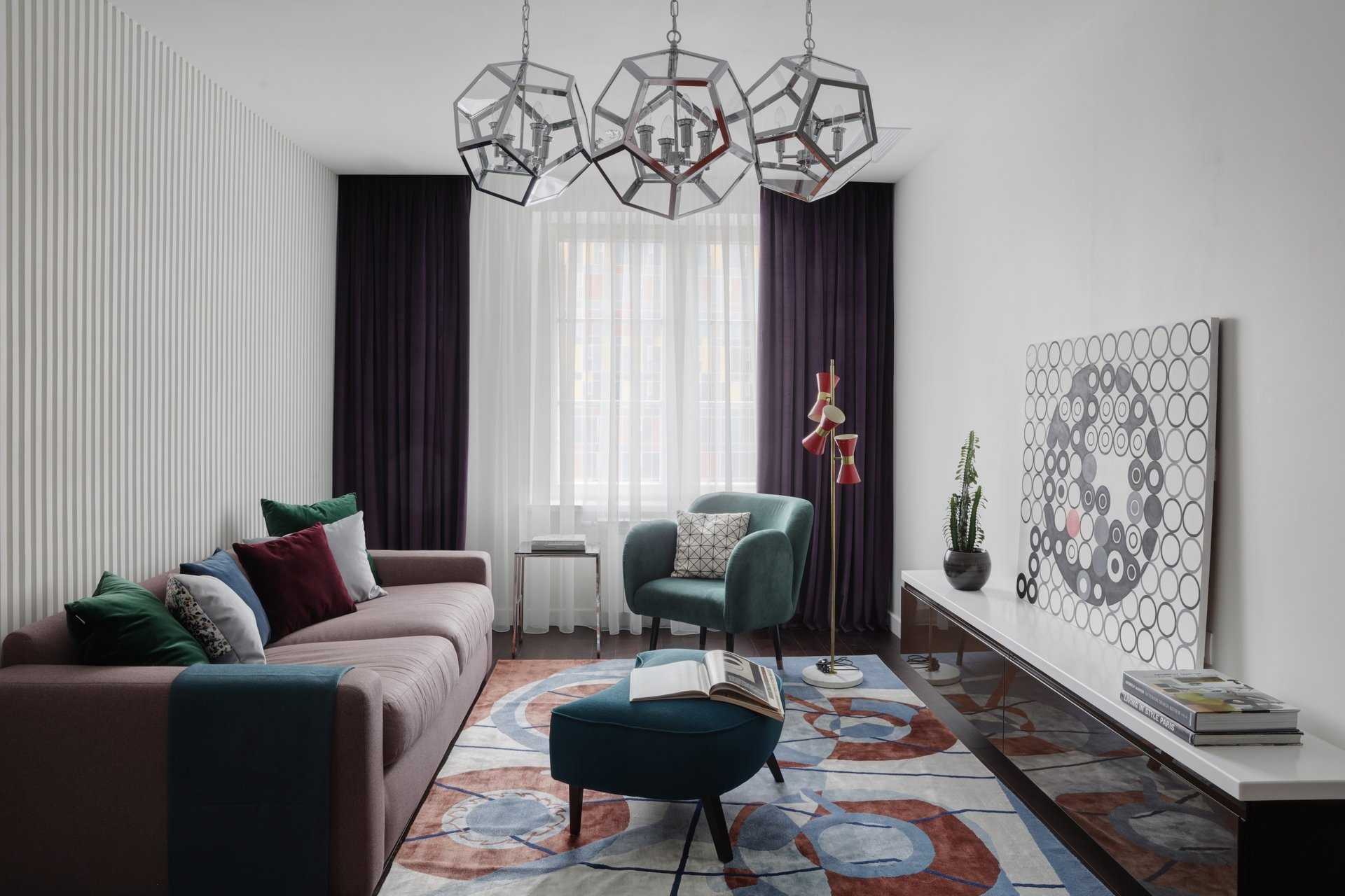 - Роскошно смотрится пастельная палитра всех оттенков: дизайн интерьера зала площадью 18 кв. м будет более эмоциональным и творческим, если выбрать сиреневый, голубой, бирюзовый, терракотовый, коралловый в выбеленных, приглушенных тонах. Интерьерные решения при этом могут быть как современными, так и ретро, но если площади для всех идей не хватает, лучше посвятить 18 квадратов абсолютной функциональности и безупречному комфорту, а не декоративности.