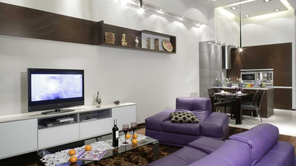 Стены фиолетового цвета в интерьере не нужно окрашивать полностью. Можно использовать акценты. Также оттенок применяют при разделении комнаты на зоны. Например, все стены окрашивают в бежевый цвет, а одну – в насыщенный пурпурный.