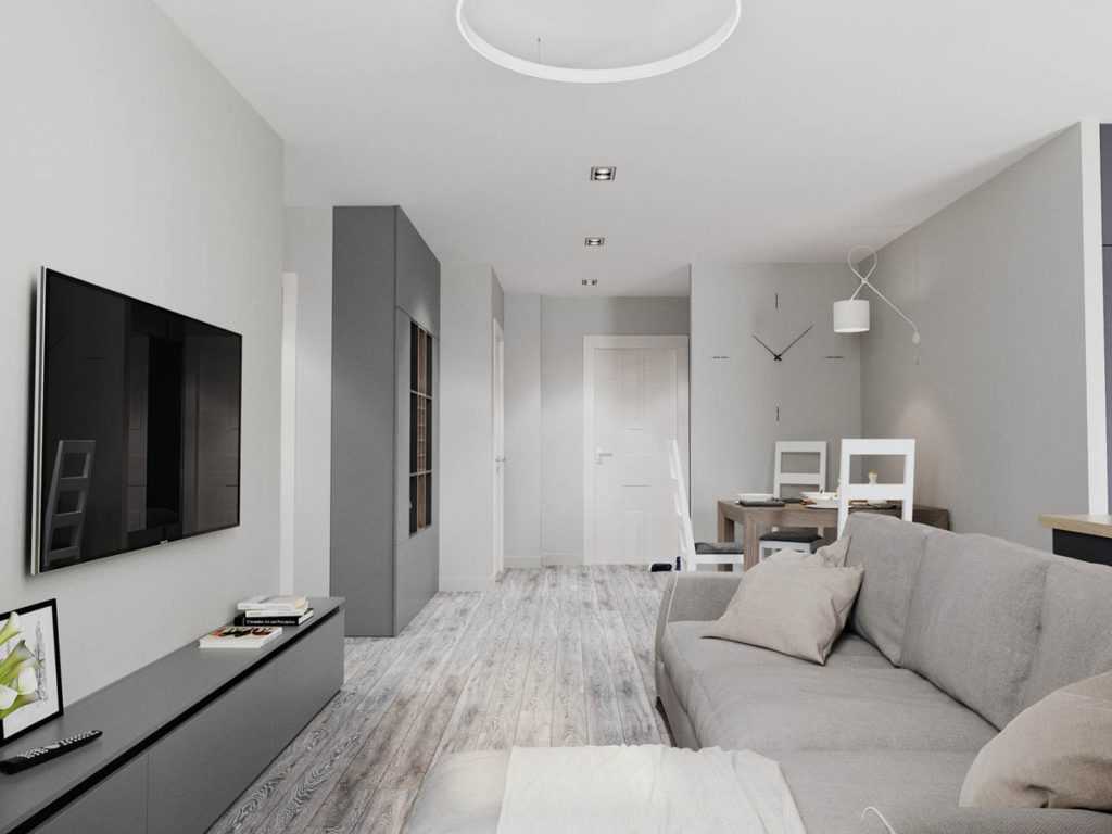 На фото зал в стиле неоклассика, оформленный в светло-серых цветах.