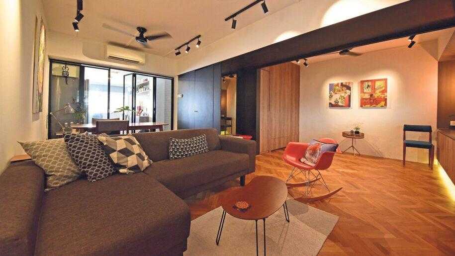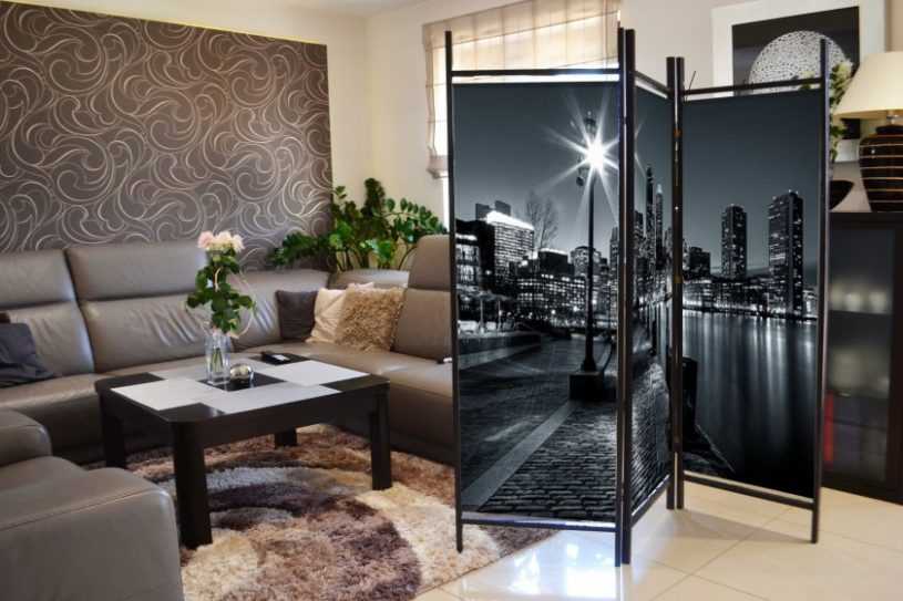 Передвижные перегородки, с помощью которых происходит разделение гостиной на спальню и гостиную, могут изготавливаться из ПВХ, декоративного оргстекла или деревянных панелей. Они компактны, органично вписываются в пространство, несут функциональную и декоративную функцию.