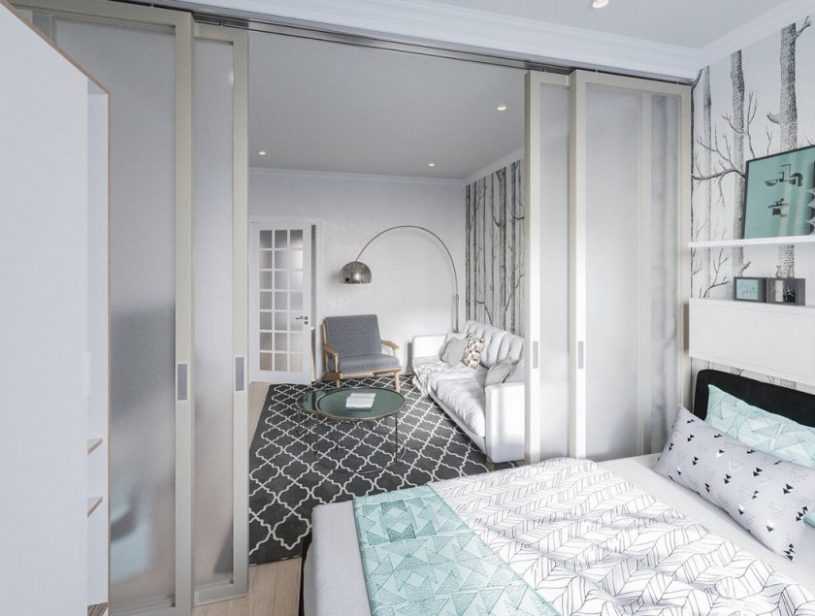 С помощью шкафа-купе можно не только выделить зоны, но и организовать одно место хранения для всех вещей. При желании, можно сделать дверцы с двух сторон, а проход между комнатами скрыть за одной из них. Единственный минус – будет перекрыт доступ солнечного света в ту часть, где нет окна.
