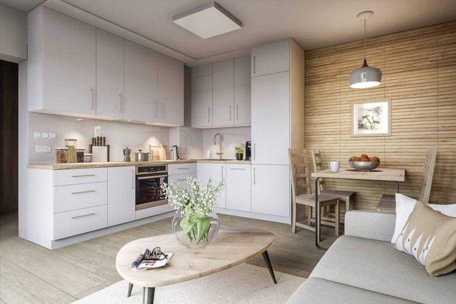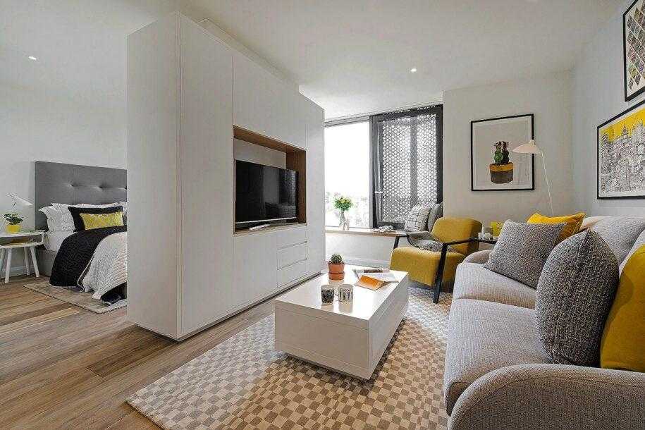 - Приобретение квартиры-студии. Данные проекты изначально, ещё на этапе черновой отделки, принято делить на функциональные зоны: гостиную, кухню, спальную комнату.
