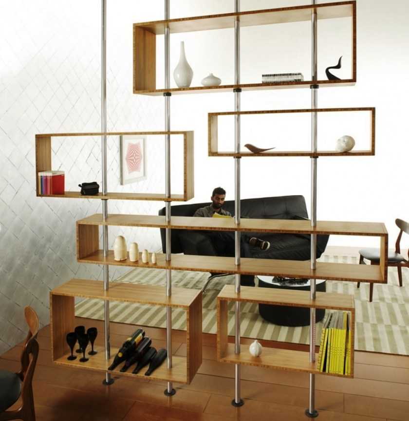Если нужен вариант полегче, обрати внимание на зонирование с помощью сквозных полок и стеллажей. Суть та же, но конструкция смотрится изящнее