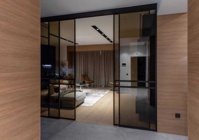 Такую конструкцию следует продумывать до начала ремонта. В раздвинутом состоянии двери создают иллюзию простора, позволяют получить максимум света и делают интерьер более функциональным.