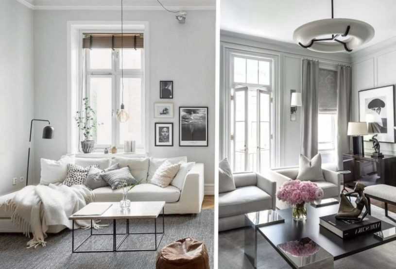 Для гостиной, оформленной в светлых тонах, противопоказано захламление предметами интерьера. Если заставить пространство мебелью, то исчезнет эффект огромной комнаты. Цвет фасадов и обивки на 2-3 оттенка отличается от основного фона. В сером зале роскошно смотрятся теплые бежевые и молочные шкафы, диван и кресла.