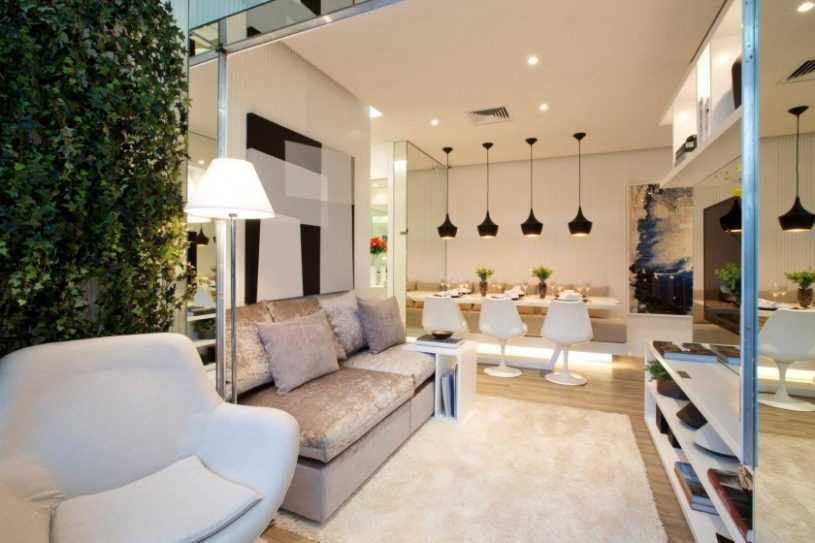 Главное правило для тесной гостиной – фон должен быть светлым. Все дело в том, что дизайн гостиной в квартире в светлых тонах не «проглатывает» свет, а отражает его и в итоге визуально делает пространство большим.