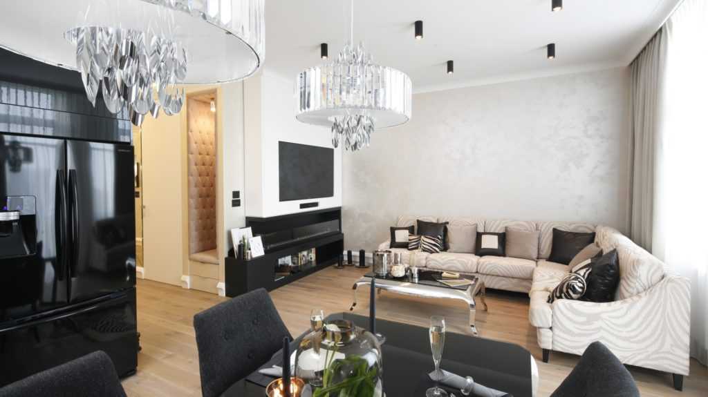 - Стоить помнить, что одной люстры в гостиной недостаточно. Верхнее освещение дает не так много света, поэтому источников должно быть как минимум два.