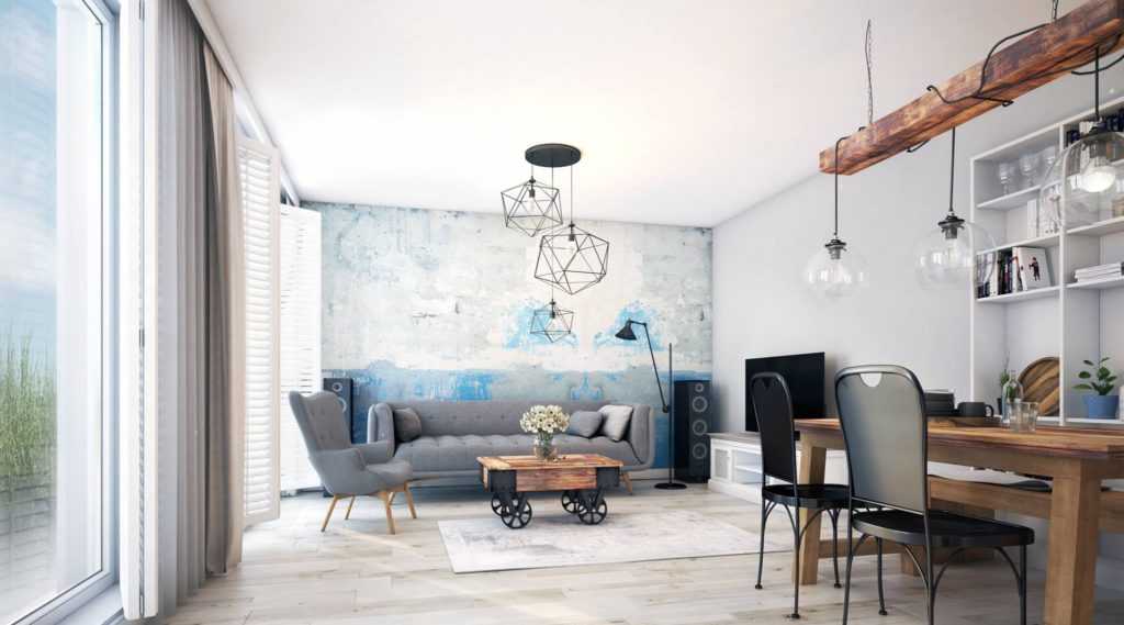 Стиль лофт относится к индустриальному направлению, предпочтение творческой молодёжи и свободолюбивых людей, для которых особых границ не существует. Интересным решением является следующий вариант: фоном являются голые кирпичные стены и столики, изготовленные из ящиков, к ним органично подойдут светильники из проволочных каркасов или люстры на длинных металлических цепях.
