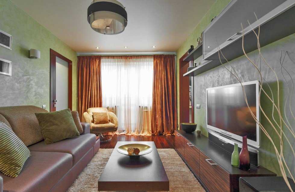 - Освещение в узкой гостиной: интерьер будет казаться шире, если одна из его длинных стен будет освещена сильнее, чем другие. Хорошим решением также является использование световых полос на потолке или в складке между потолком и стеной. Также стоит выделить нишу или мебельную полку.