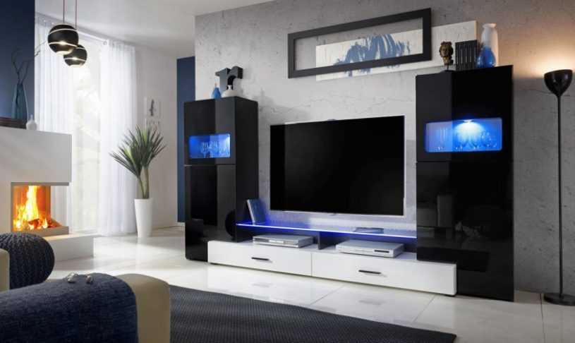 В современных стенках конструкторы часто предусматривают подсветку. Также можно подобрать угловые стенки со встроенным кабель-менеджментом. В таких удобно размещать провода аппаратуры. Если стенка изготавливается по индивидуальному дизайну, стоит заранее продумать её соседство с розетками. Это облегчит размещение техники.