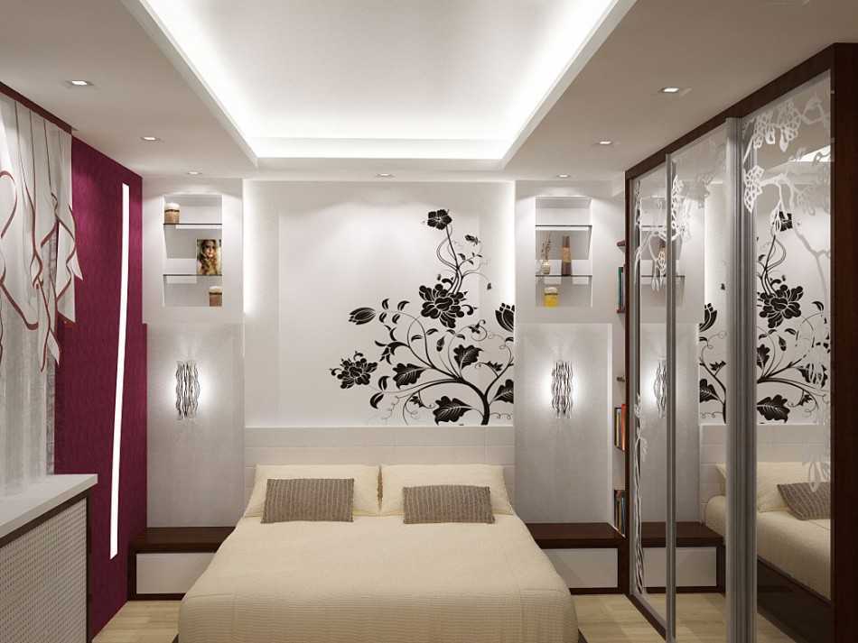 С помощью применения легких и прозрачных стекол комната загроможденной не будет. Дополните оформление спальной комнаты с помощью применения журнального столика, или дверного полотна. Часто потолки оформляют соответственным образом.