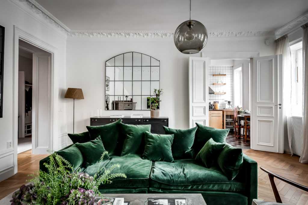 Изумруд можно также ввести в гостиную с мебелью. Интенсивно зеленый диван, растекающийся по белоснежной или слегка серой стене, будет иметь огромное влияние. Гостиная — представительская комната, поэтому давайте не бояться добавить роскоши — изумрудная мебель и стены будут великолепно смотреться в компании золотых аксессуаров, например, элегантных светильников, рамы для зеркал и картин, современных подсвечников и дизайнерских безделушек.
