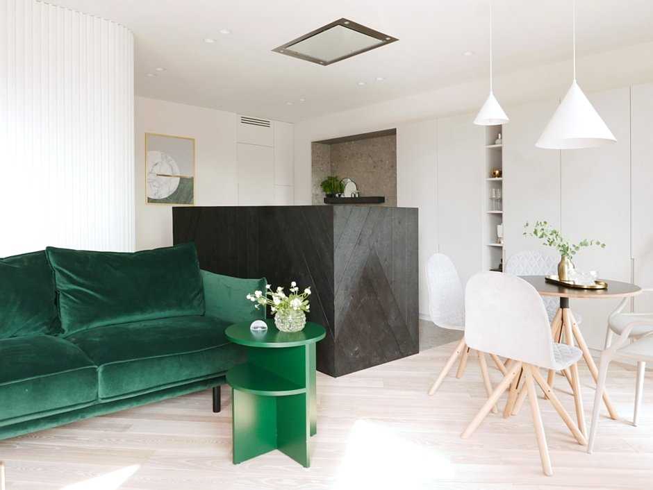 Сочетание зелёного дивана с элементами интерьера других цветов