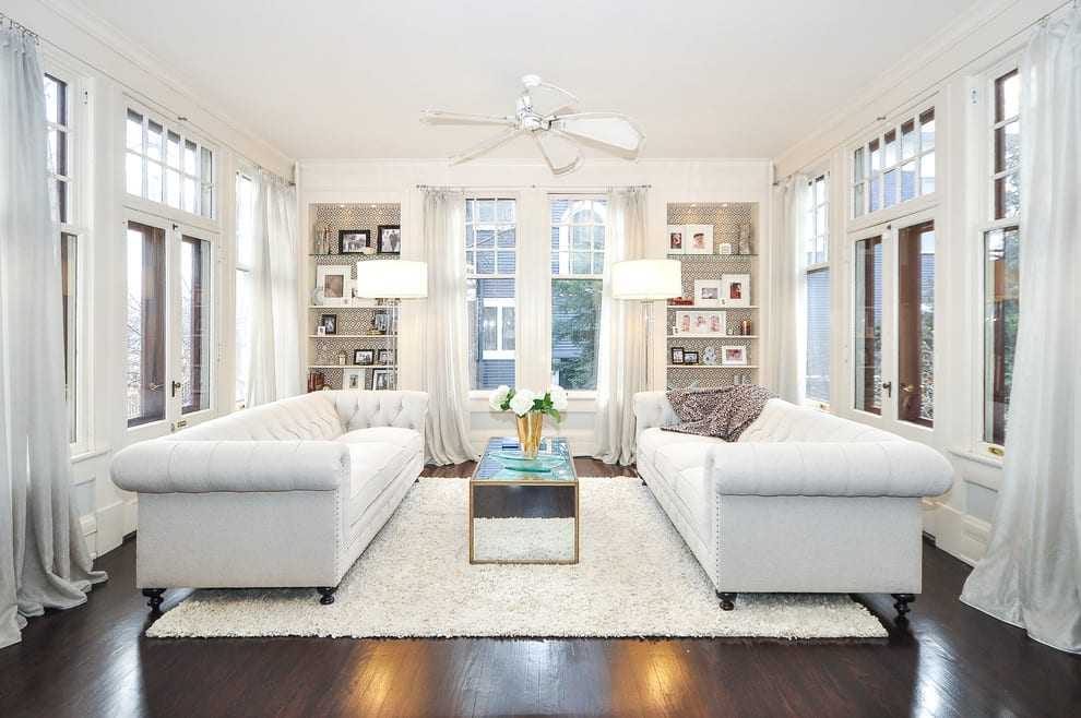 Полупрозрачный белый тюль на большом окне завершит общую картину. Интерьер получится свежим и просторным;