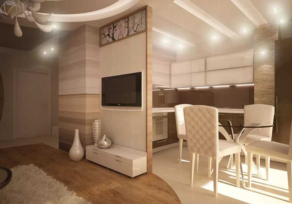 В одной комнате совмещены гостиная и спальня, чтобы подчеркнуть разное назначение частей пространства, она поделена на две равные часть вспомогательной перегородкой. При этом сохраняется общность пространства. Отделка возведённой стены в классическом стиле дополняет декоративную атмосферу интерьера.