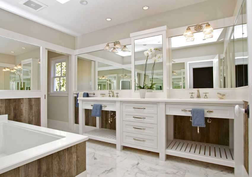 Бело-коричневая ванная комната имеет более теплый и уютный вид