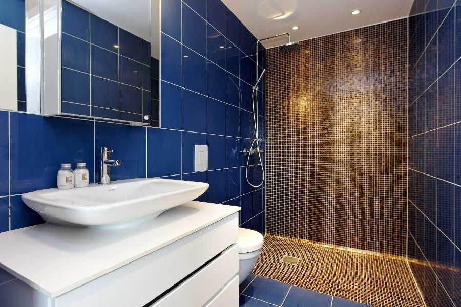 Оттенки голубого и синего. На фото ниже представлен дизайн ванной на 3 кв. м без туалета в сине-белой цветовой гамме. Всего два оттенка создали гармоничный ансамбль, при этом синий выражен не только в плитке, но и в деталях: полотенцах, коврике, аксессуарах. Его можно заменить на бирюзовый, ультрамарин, или же более пастельный оттенок.
