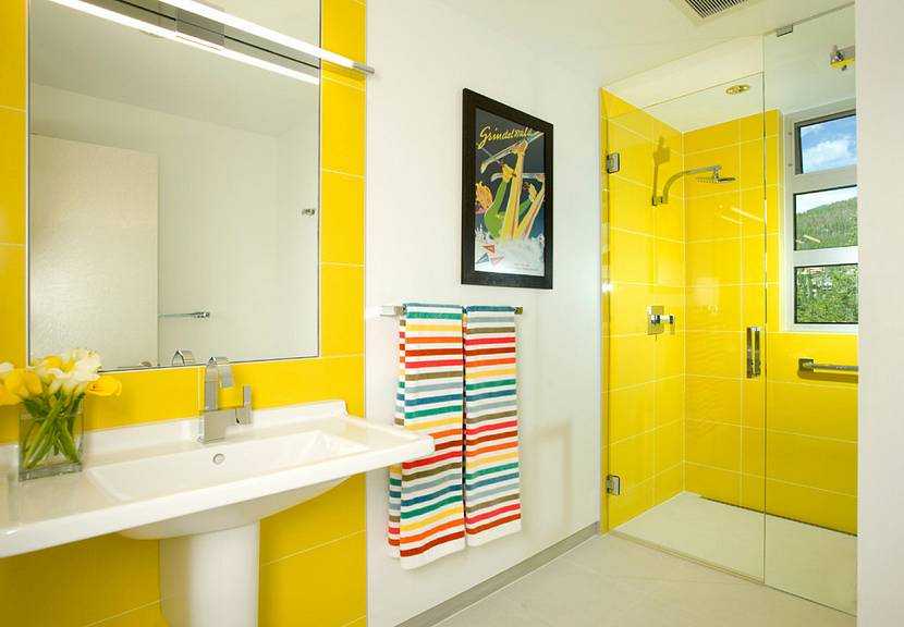 - Бело-золотистая гамма, дополненная ярко-зелеными и огненно-красными вставками. Ванна по-прежнему чистая, но без мрака и скуки;